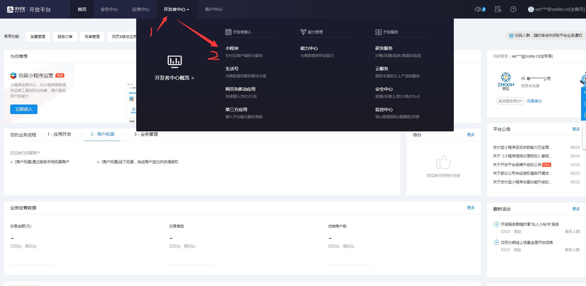 > 支付宝小程序商城需要进行对应的设置。 1、在支付宝开发平台申请一个账号(必须使用企业支付宝),地址:[https://open.alipay.com](https://open.alipay.com/)。 2、登录成功后,依次点击`开发者中心`-->`小程序`菜单,进入小程序管理界面,如下图:  3、进入`我的小