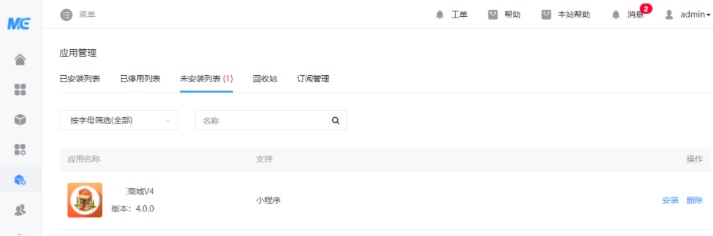 **1.在微擎上购买好模块之后,登录自己的微擎系统,进入应用管理安装禾匠商城(安装过程请勿手动刷新或关闭页面,耐心等待安装结束)**  **2. 安装完成之后进入平台管理,创建微信小程平台,并添加禾匠商城应用**